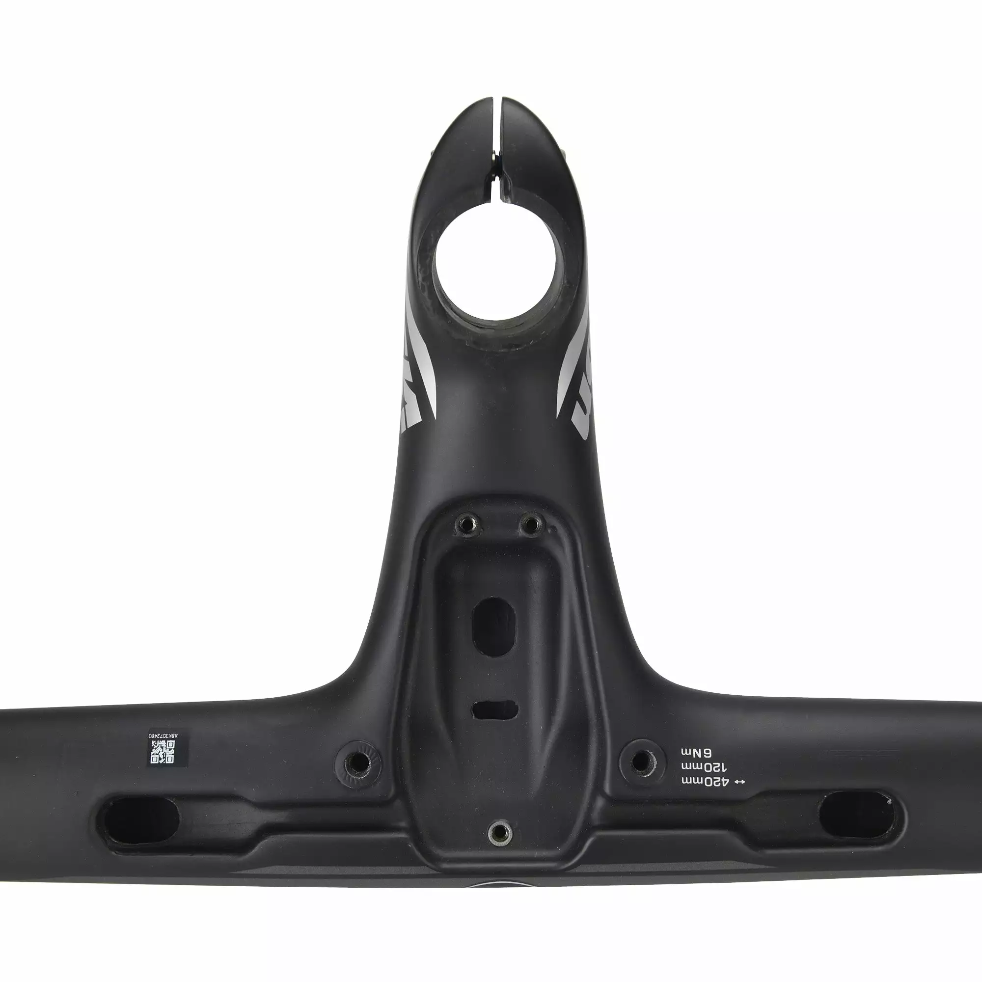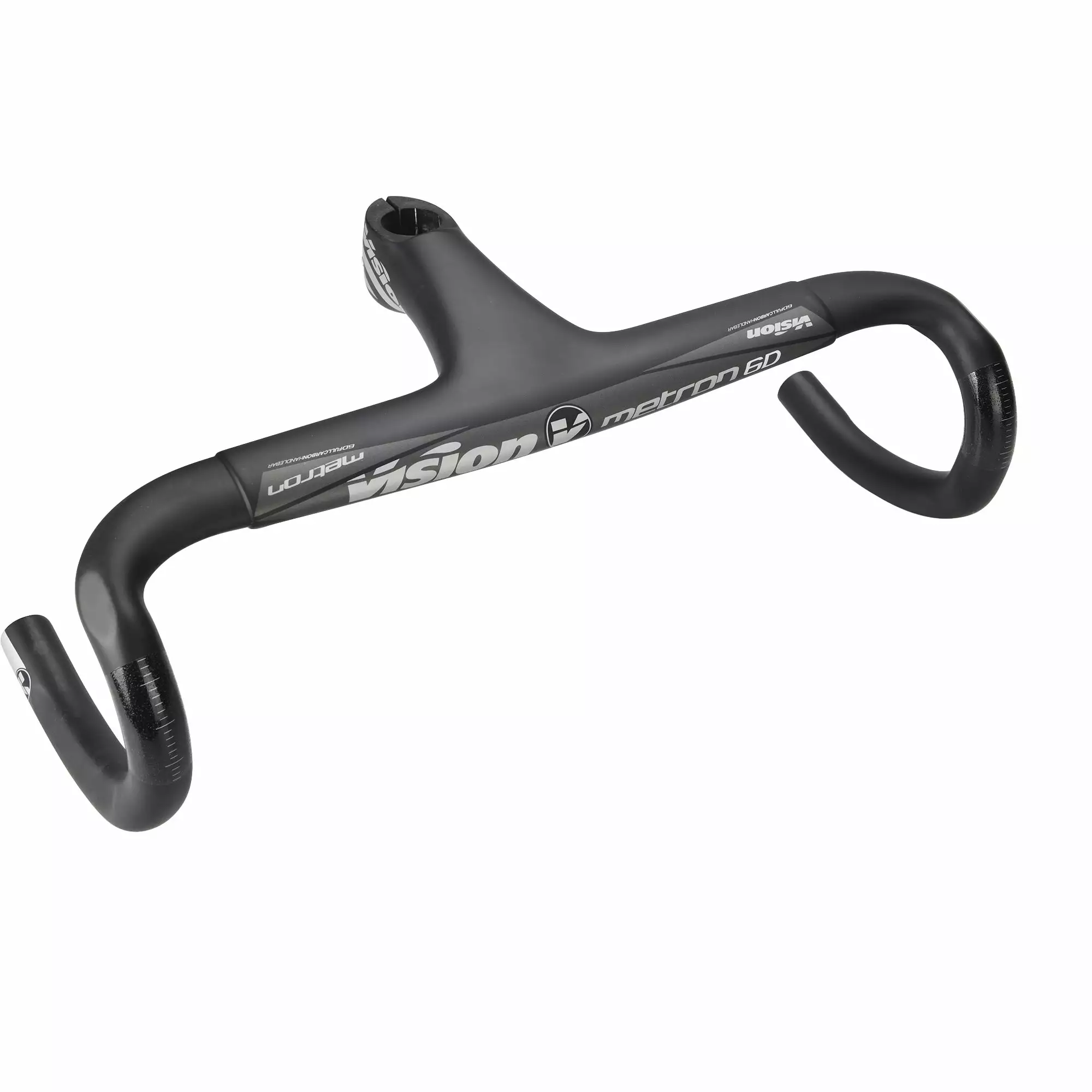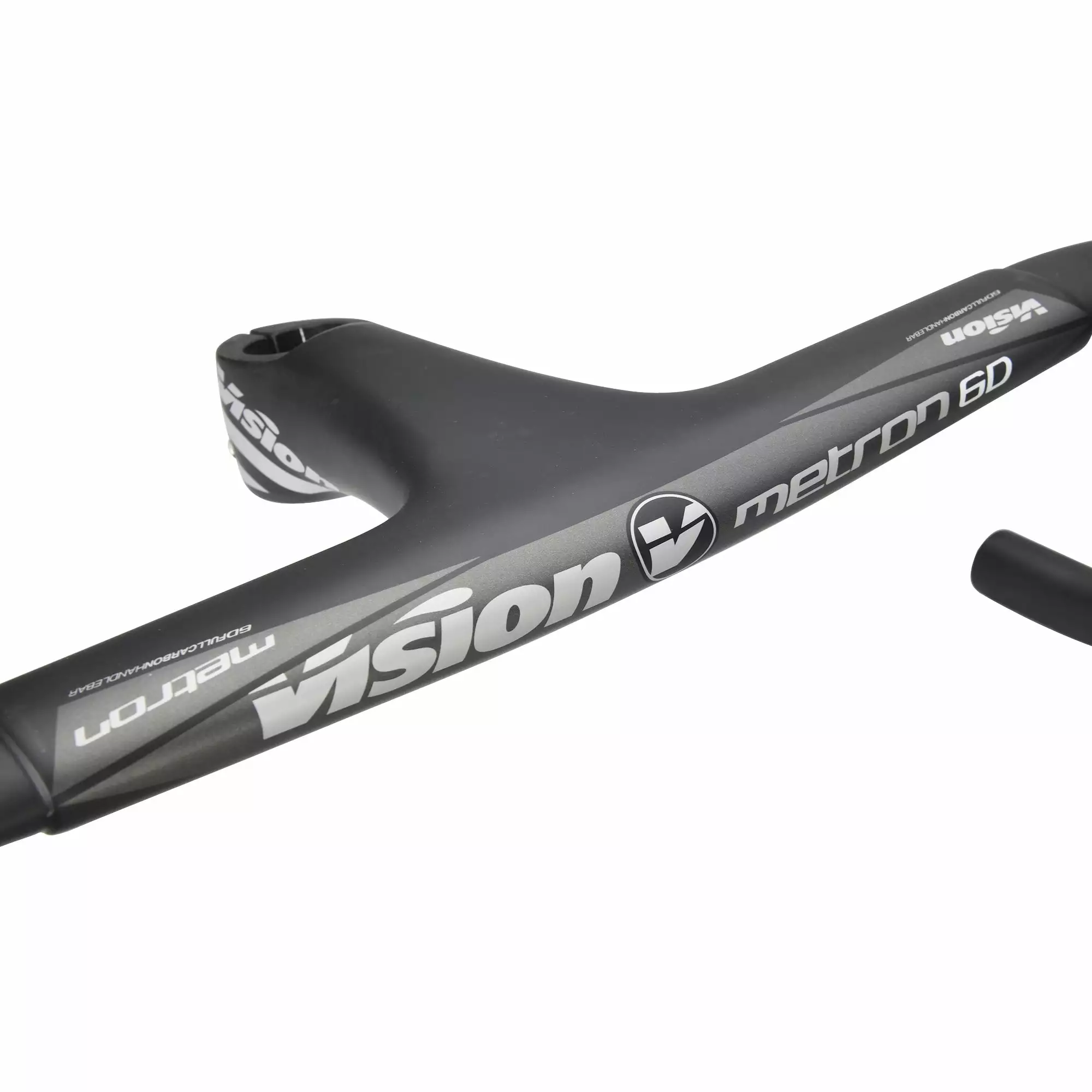 Conçu en carbone, ce cintre Metron 6D bénéficie d’une construction renforcée sur les zones de fixation des leviers de freins. Il ménage des passages internes pour les câbles des transmissions Di2 et prévoit d’intégrer le boîtier de connexion sous la potence.