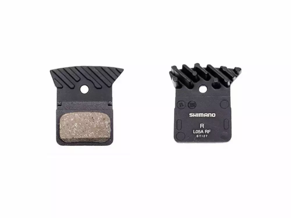 La nouvelle plaquette de frein en résine L05A-RF avec ailettes de refroidissement de Shimano pour les freins à disque Dura Ace, Ultegra, 105 et GRX à 2 pistons Flat-Mount présente une meilleure résistance à l’usure que les modèles précédents. Avec une force de freinage bien estimable pour un freinage régulier, les plaquettes en résine synthétique offrent une réduction du bruit lors du freinage dans des conditions sèches et humides.